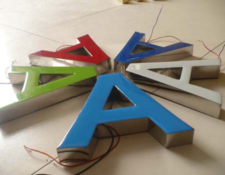 不銹鋼燈箱發光立體字是由亞克力發光字箱體和LED光源組成。首先電腦雕刻機把亞克力字形和圍邊雕刻出來,用粘接劑把亞克力字面與圍邊粘接在一起,接成箱體, 底板用等離子切割或雕刻機切割而成。 其內部置入LED燈光源組合而成, 一次成型,不用修邊,不用打磨,外觀精美,表面光亮如鏡, 夜晚亮燈立體感強。